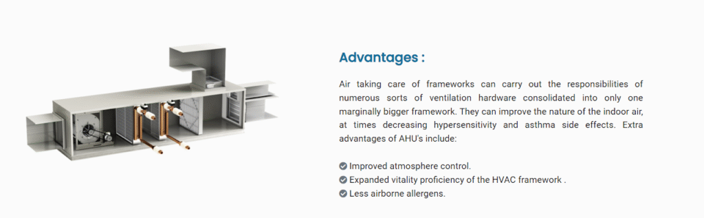 The fundamental capacity of the Air Handling Unit is take in outside air, condition it and supply natural air to a structure. All fumes air is released, which verifies an adequate indoor air quality. Contingent upon the required temperature of the adapted air, the natural air is either warmed by a recuperation unit or warming curl, or cooled by a cooling loop.